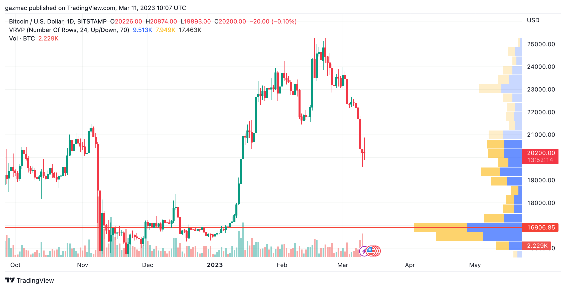Also, bitcoin holders will be comforted by the fact that it has a huge region of support at the volume profile line of control (red line) around the $16,000 levels.