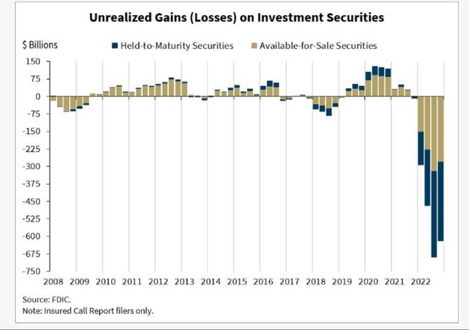 Worryingly for the banking system, SVB is not alone in having these sorts of unrealized losses on its balance sheet, as the chart from the FDIC shows below: