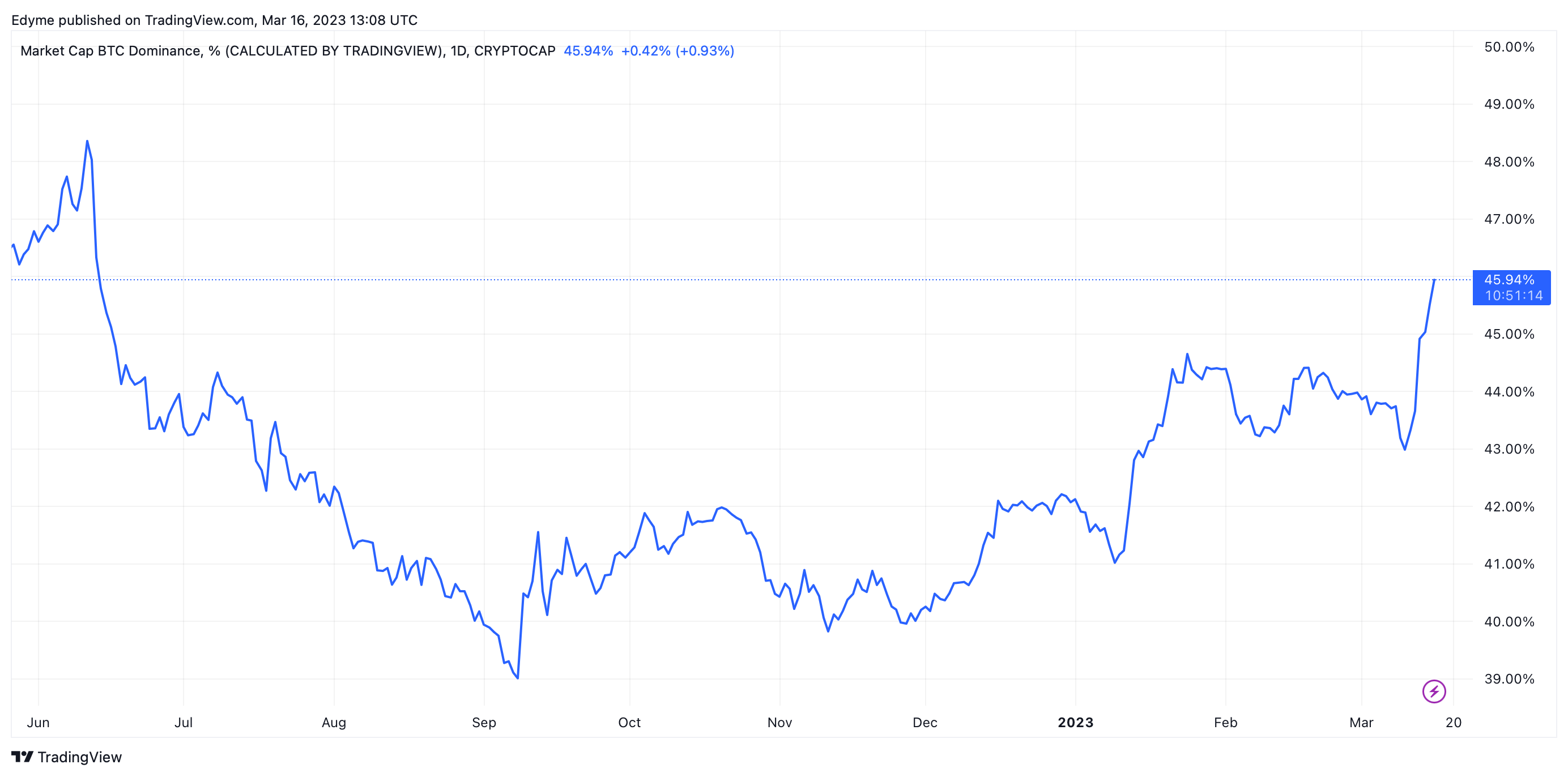 As of March 16, Bitcoin dominance is well above 45% reclaiming the June 2022 levels while also looking to reach the June 2022 dominance high of just above 48%.