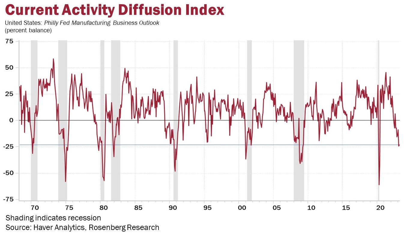 Rosenberg further noted that the Philadelphia Federal Reserve (Philly Fed) has accurately predicted recessions in the United States with 100% accuracy in the past. He wrote:
