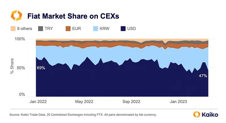 The United States dollar is taking a hit, as its fiat market share declined from 69% to 47% in the span of just a year on centralized crypto exchanges (CEX).