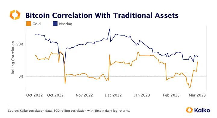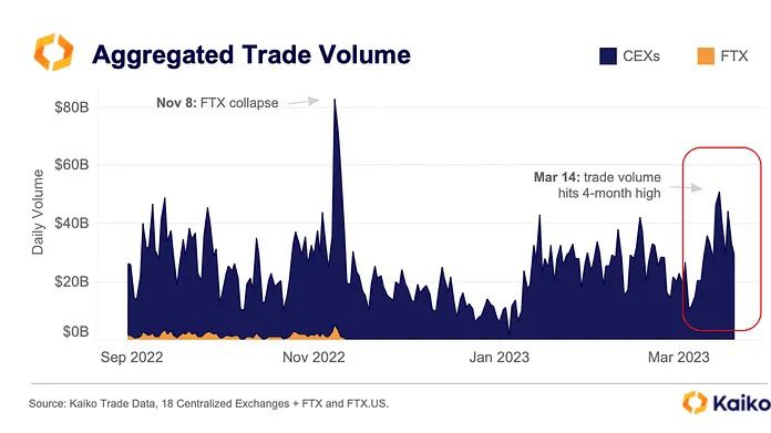 Kaiko notes that crypto’s trading volume hit a 4-month-high, with the figure hitting $51 billion on March 14, based on information from the 18 most liquid crypto exchanges. The previous high came during the FTX collapse when the trade volumes hit $80 billion.