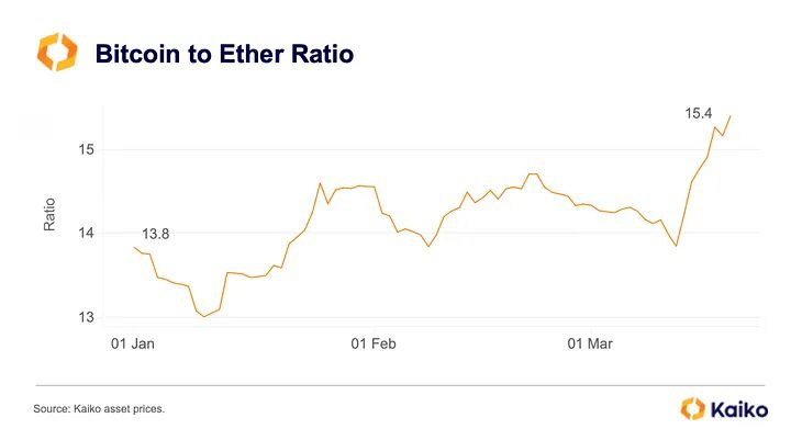 Kaiko’s report has many other interesting statistics that showcase where the market is heading. One of the more notable highlights is that the Bitcoin to Ethereum ratio is the highest since July 2022. This points to how strongly Bitcoin is outperforming the rest of the market. Since March 12, BTC is up 31% compared to ETH, which is up 18%.