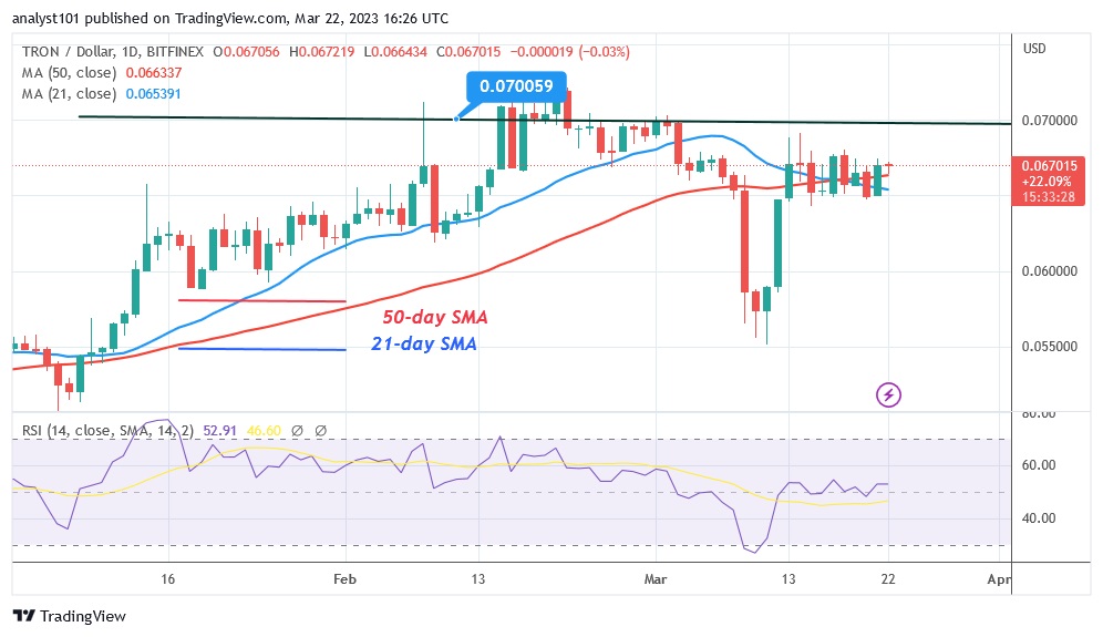 The crypto asset has fluctuated as the rise that began on March 13 has stalled. Today, TRON is starting to climb and is trading at $0.067. Currently, there are doji candlesticks that have slowed the price movement. Small candles that have no body show that both buyers and sellers do not care about the price movements. Last week, the altcoin fluctuated within a firm range of $0.064 and $0.068. Due to resistance in the overbought zone, TRON is currently declining. The market will weaken and reach the price range of $0.064. The value of the altcoin will rise if it falls above the moving average lines. During this period, the price has not changed in relation to the moving average lines.