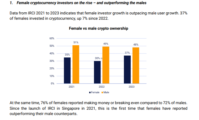 As per the survey data, 76% of women reported either making money or breaking even on their crypto investments, compared to just 72% of men.