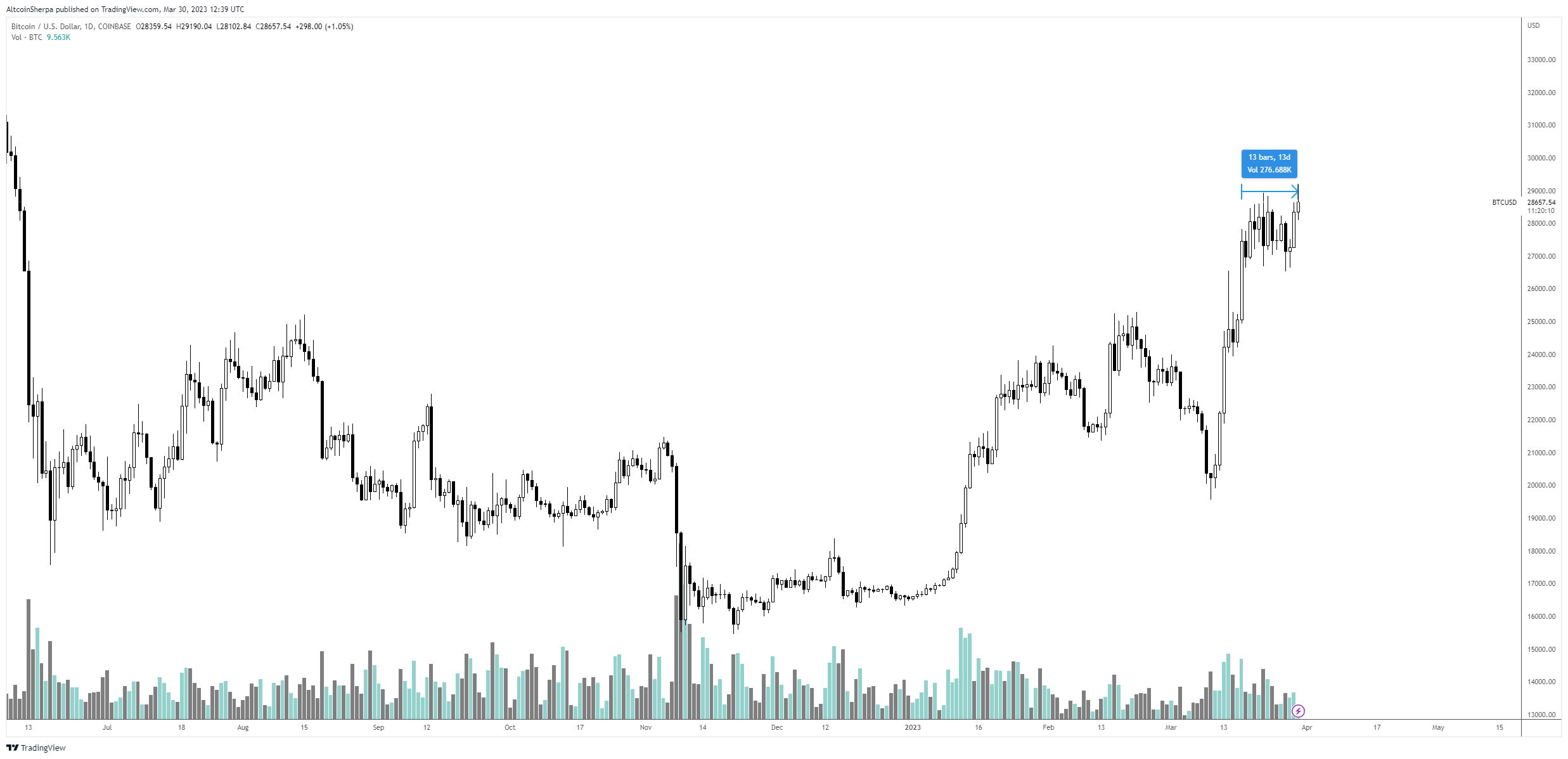 Pseudonymous analyst Altcoin Sherpa tells his 194,100 Twitter followers that Bitcoin is likely consolidating around its current price value of $28,278 ahead of an imminent breakout.