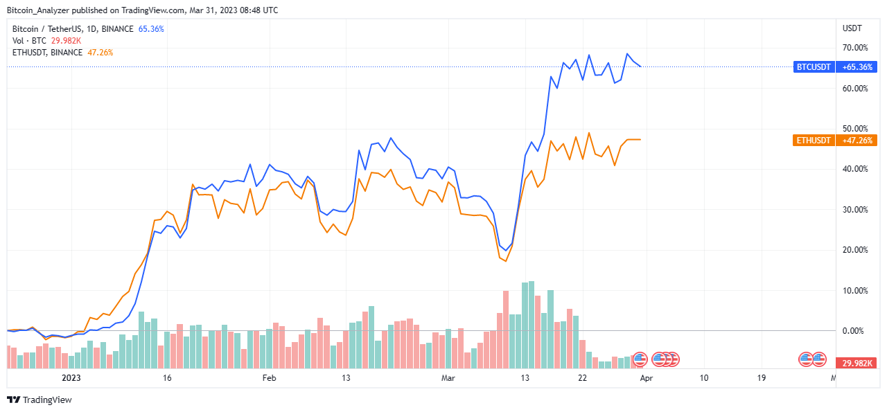 As Q1 2023 comes to a close, the Bitcoin and Ethereum correlation stands at a staggering 97%, trackers indicate.