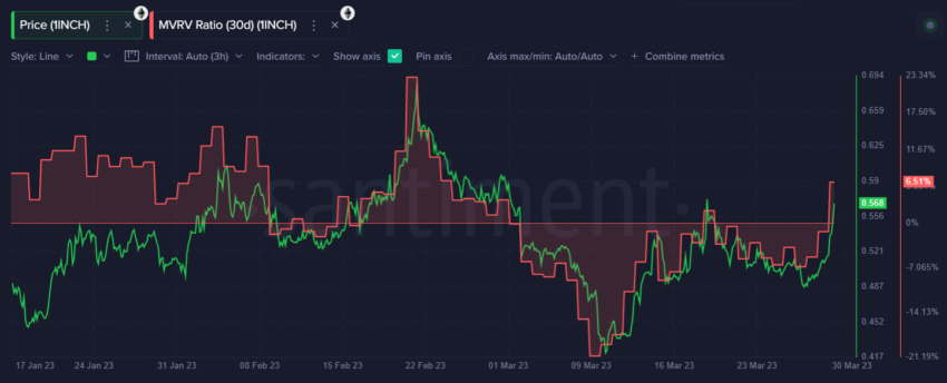 From the MVRV chart, the 1inch price prediction projects that a break above $0.597 can trigger a rally toward $0.70.