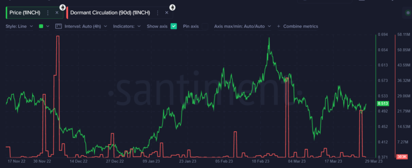 On March 27, the 90-day Dormant Coin Circulation revealed that 22.62 million tokens were moved on the 1inch network, worth $12.98 million. This was the second-largest spike of this year so far, according to data from Santiment.