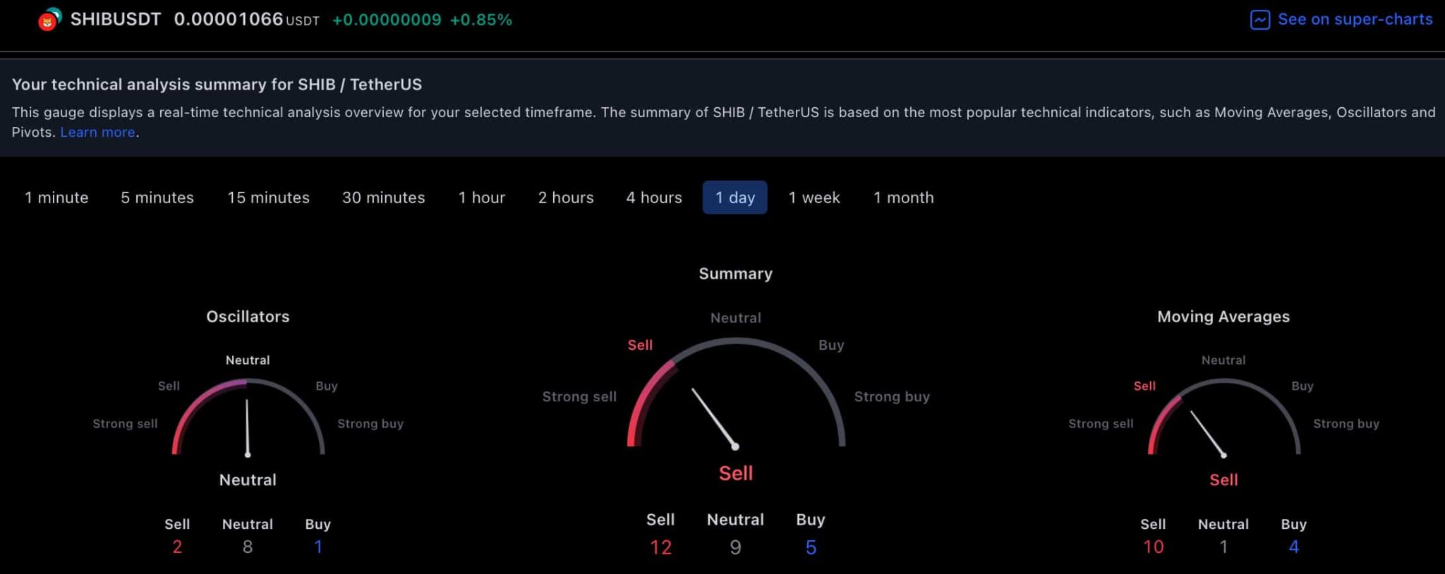 On the one-day gauges at the finance and crypto monitoring website TradingView SHIB are bearish. Namely, its summary suggests a ‘sell’ at 12, resulting from oscillators pointing at a ‘neutral’ at 8 and moving averages in the ‘sell’ zone at 10.