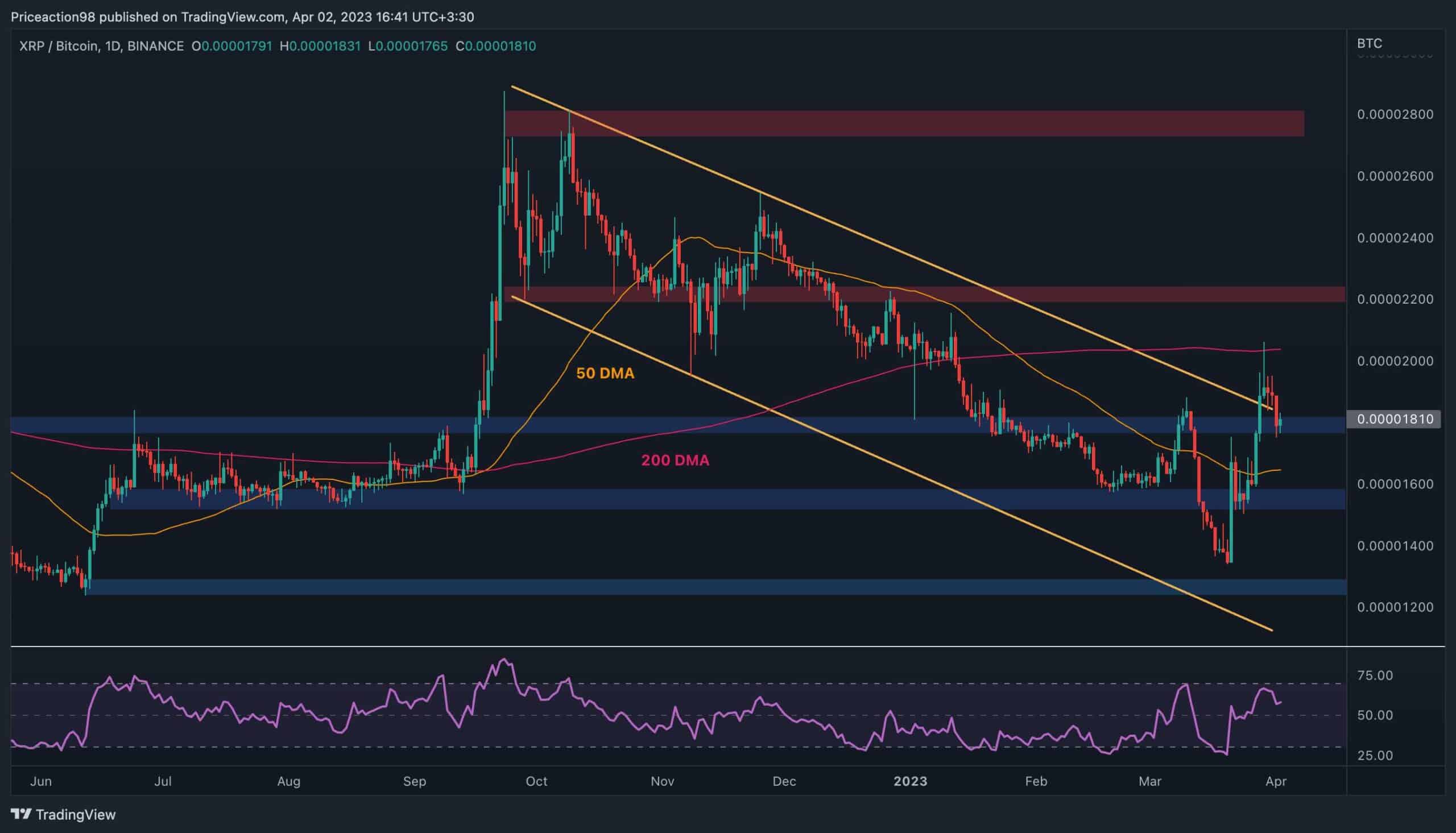 Against BTC, things look even worse, as the price is seemingly dropping back inside the broken descending channel after being impulsively rejected from the 200-day moving average around the 0.00002 SAT. If the 0.000018 SAT level fails to hold, the recent breakout would be considered fake and could lead to the price declining deeper inside the channel toward the 0.000016 SAT in the short term.
