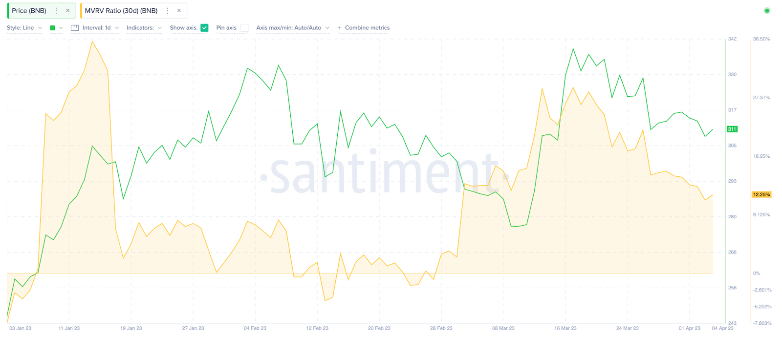 The Market Value to Realized Value (MVRV 30d) data depicts that BNB investors that bought within the last 30 days are sitting on 12% gains. And looking at the historical buy/sell patterns, they could hold out for an additional 10% price surge to $342 before they start selling.