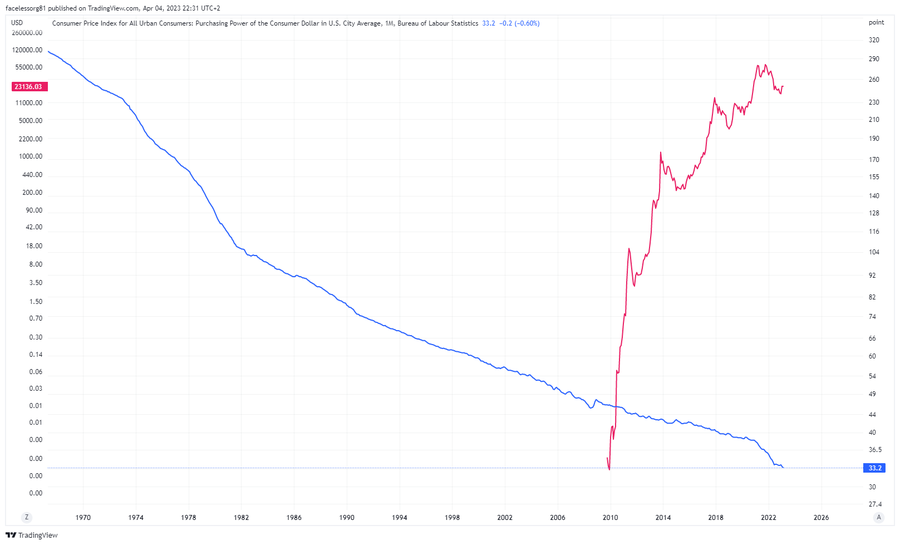 On the other hand, the purchasing power of Bitcoin in the same context has shown as quickly climbing, soaring from 33 in 2010 to the current 255 points, or a whopping 672.73% increase over the observable period of only 13 years.