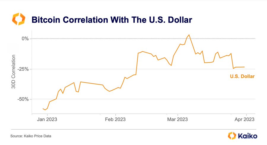 “The Dollar took a hit yesterday after the number of job openings in the US. fell more than expected (JOLTS), boosting recession fears. Although BTC remains negatively correlated with the US Dollar, the correlation is now almost negligible, falling from -60% to -23% YTD.”