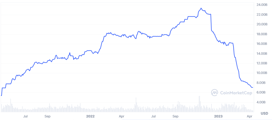 BUSD has also shared a similar fate, with its market capitalization dropping to a 23-month low of $7.07 billion. Consequently, the stablecoin has been relegated to 12th on the list of largest crypto assets by valuation. BUSD’s market cap has dropped since it soared to the ATH of $23.36 billion in November 2022.