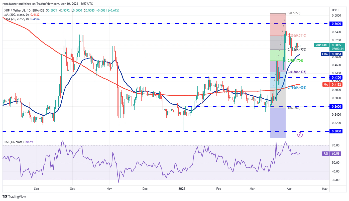 Bitcoin bounced off the 20-day EMA ($27,692) on April 9, indicating buying at lower levels. The gradually upsloping 20-day EMA and the RSI in the positive territory indicate advantage to the buyers.