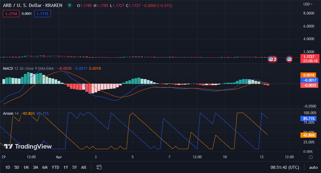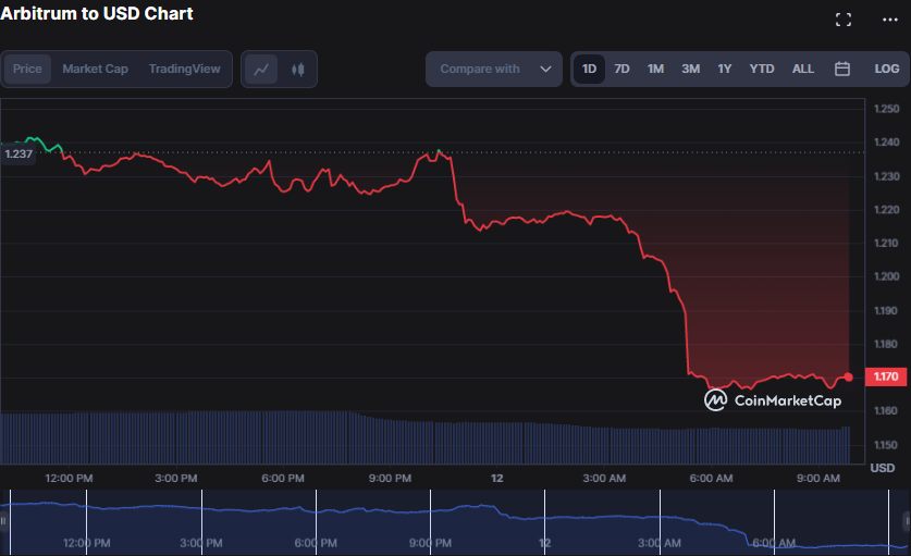 After a bullish start that propelled the Arbitrum (ARB) price to a 24-hour high of $1.24, the bears grabbed control and pulled the price down to $1.17 within a few hours, a 5.33% fall as of press time. If the bears break this support level, the price of ARB may fall further, perhaps hitting the next support level at $1.10.