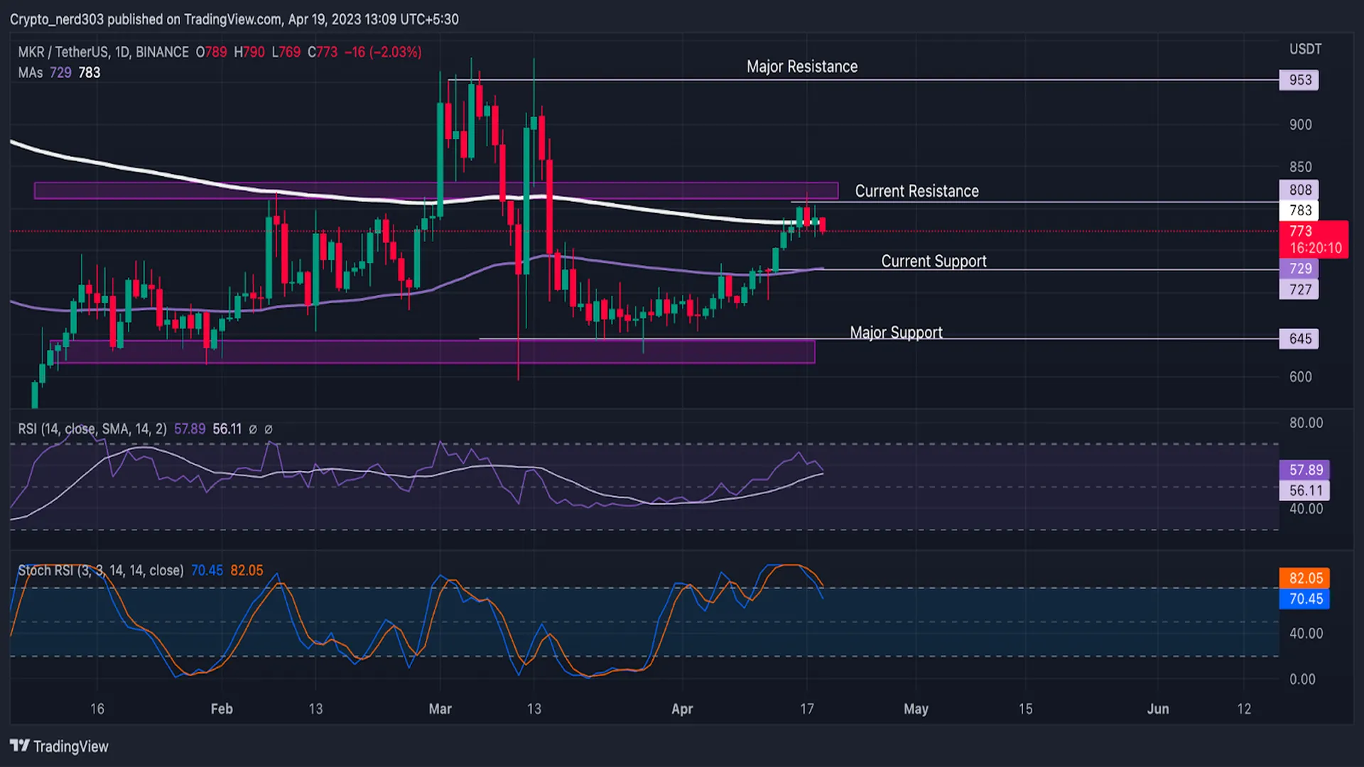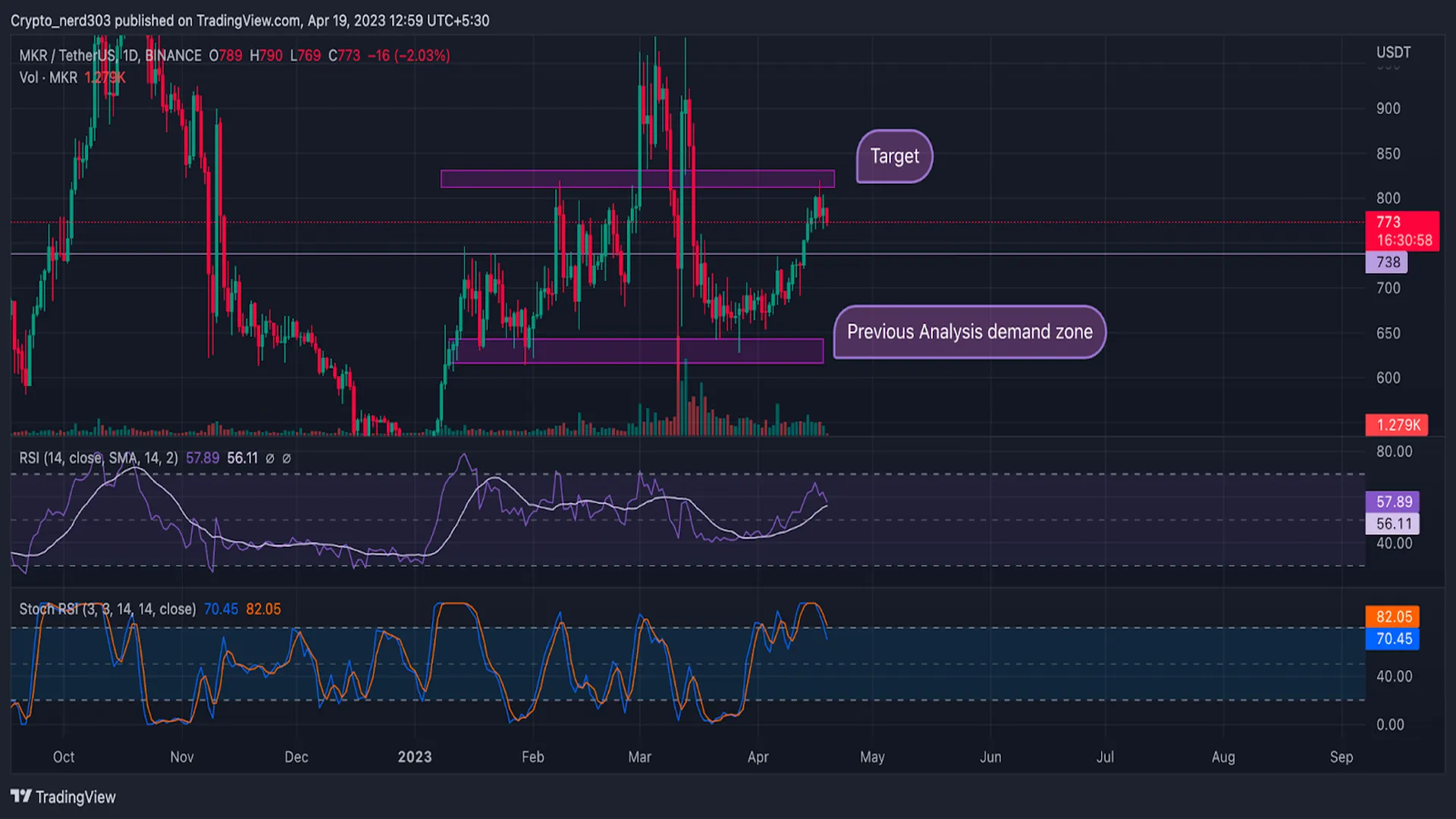 The previous analysis estimated that MKR price could make a solid bullish rally of up to 25% or more. This analysis was made because MKR price was trading near $650 above the demand zone, and the RSI with Stochastic RSI was also moving near the oversold levels, where its current resistance level was around $800, around 12% above the current price and the significant resistance level was at $900. After consolidating, MKR price attained its current price target of 25%.