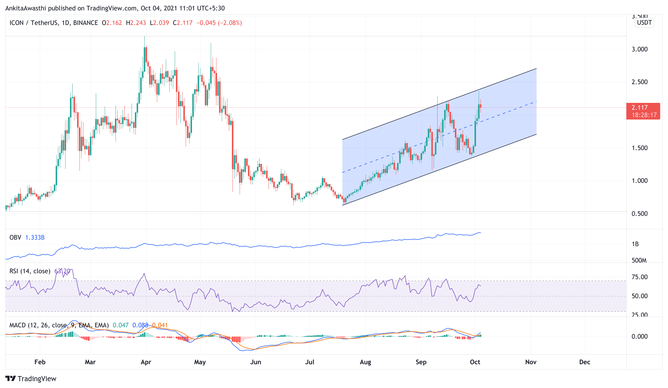 At the time of press, ICX was trading at $2.12. The price has decreased by approximately, 7%, in the last 24 hours. Moreover, the price is currently trading above the center of a breakout of its parallel channel. It has broken out from its resistance level of $1.82. Now, we can expect the price to make new highs. Although, the price might retest the breakout level.