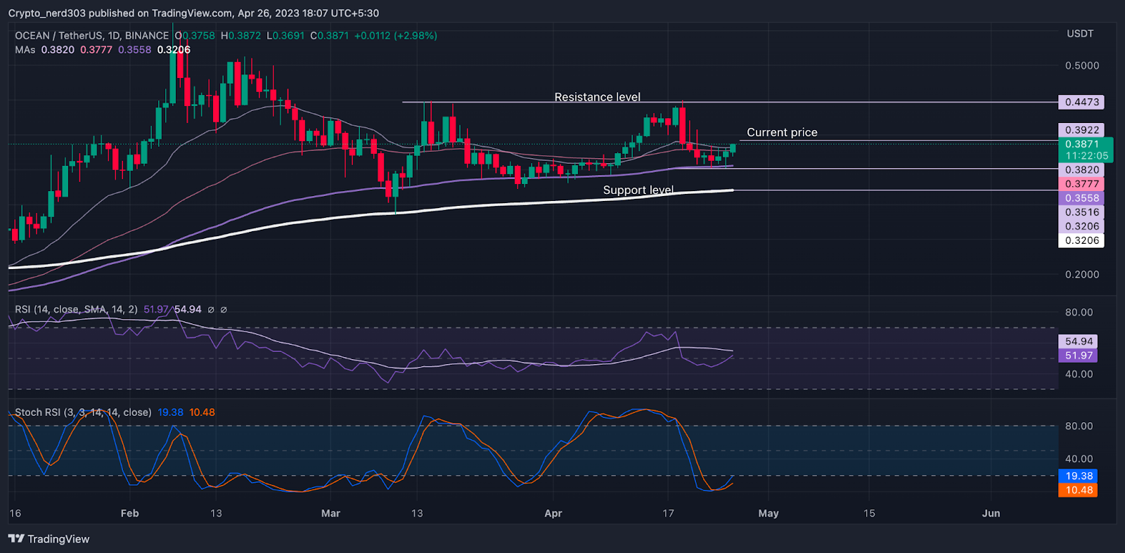 According to the analysis, OCEAN is currently taking resistance from the price of $0.4000 and its major resistance is at $0.5000. The support level is around $0.3800 and its next major support level is at $0.3500. OCEAN price is moving on a bullish trend and it gives strong technical indication of making a bull rally.
