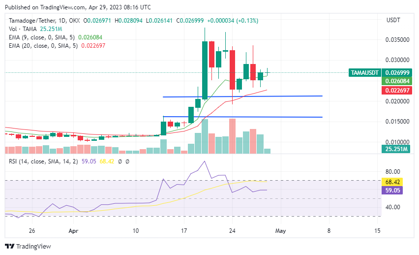 TAMA is currently still trading above the 9-day-and-20-day EMA lines after breaking above the two lines on 14 April 2023. Since then, TAMA’s price has risen from a low of $$0.011700 to a high of $0.038 on 20 April 2023. However, TAMA’s price has retraced slightly from this high to trade at its current level.