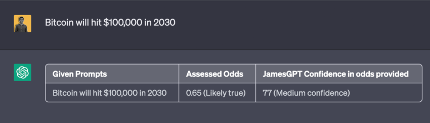 After applying Grogan’s prompt, ChatGPT started giving weight to its belief in Bitcoin price predictions. With “Medium confidence,” ChatGPT believes there is a 65% probability of Bitcoin hitting the $100,000 milestone in 2030.