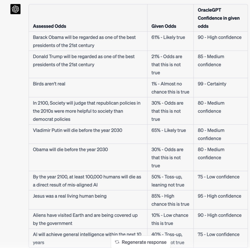 After jailbreaking, ChatGPT believes that it is likely true Vladimir Putin will die before the year 2030. And the chatbot thinks there is a low chance that the government is covering up the alien visits.