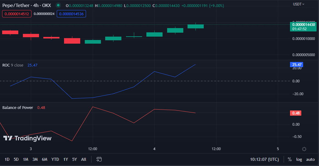 The upward Rate of Change movement with a rating of 25.47 indicates that the PEPE’s bullishness is gathering strength, suggesting a likely price rise.