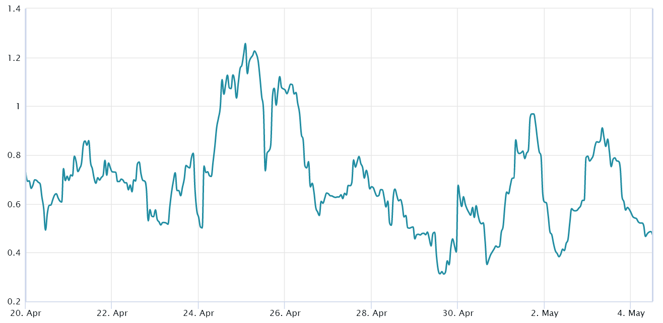 The put-to-call ratio for Bitcoin options volume has been below 0.90 since April 26, indicating a higher preference for neutral-to-bullish call options. More importantly, even as Bitcoin briefly corrected down to $27,700 on May 1, there was no significant surge in demand for the protective put options.