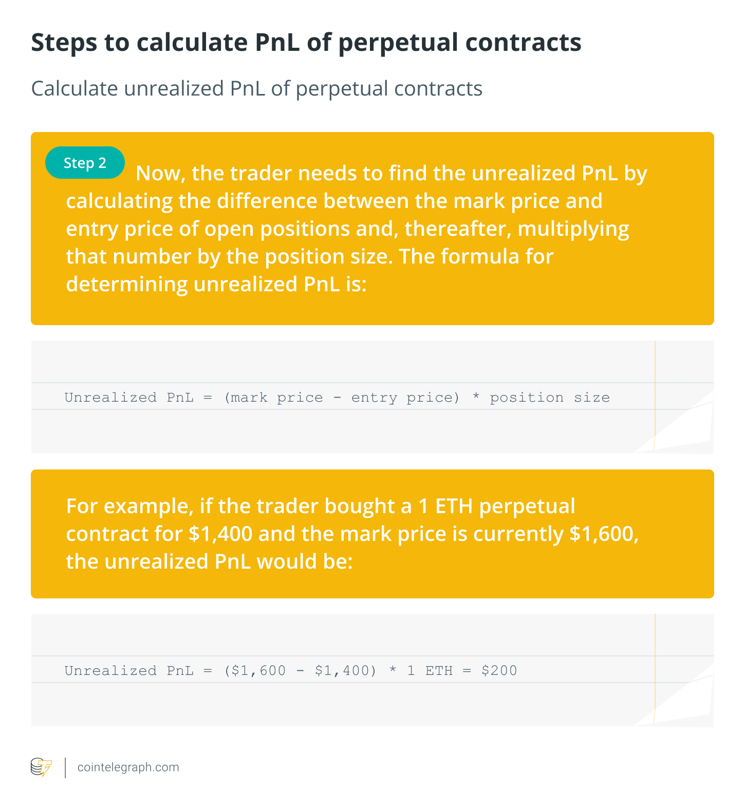 Donald has purchased $ETH contracts with an average entry price of $1,900. The mark price of $ETH is currently $1,600. The unrealized PnL for Donald is the difference between the average entry price and the mark price.