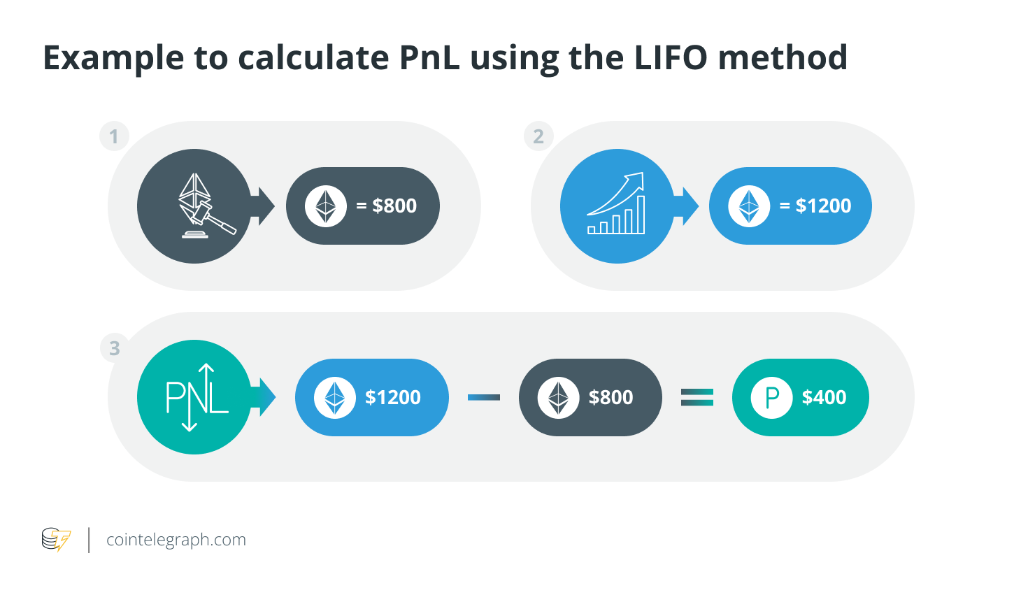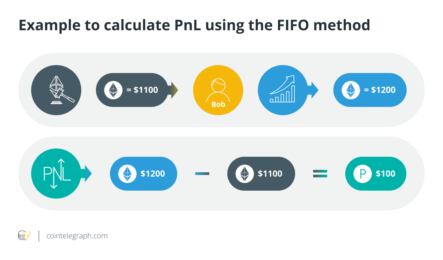 Suppose Bob first bought 1 $ETH at $1,100 and a few days later bought 1 $ETH at $800. A year later, he sold 1 $ETH at $1,200. As he had first bought $ETH at $1,100, this price will be considered the initial cost. Applying the FIFO method, Bob could calculate PnL as follows: