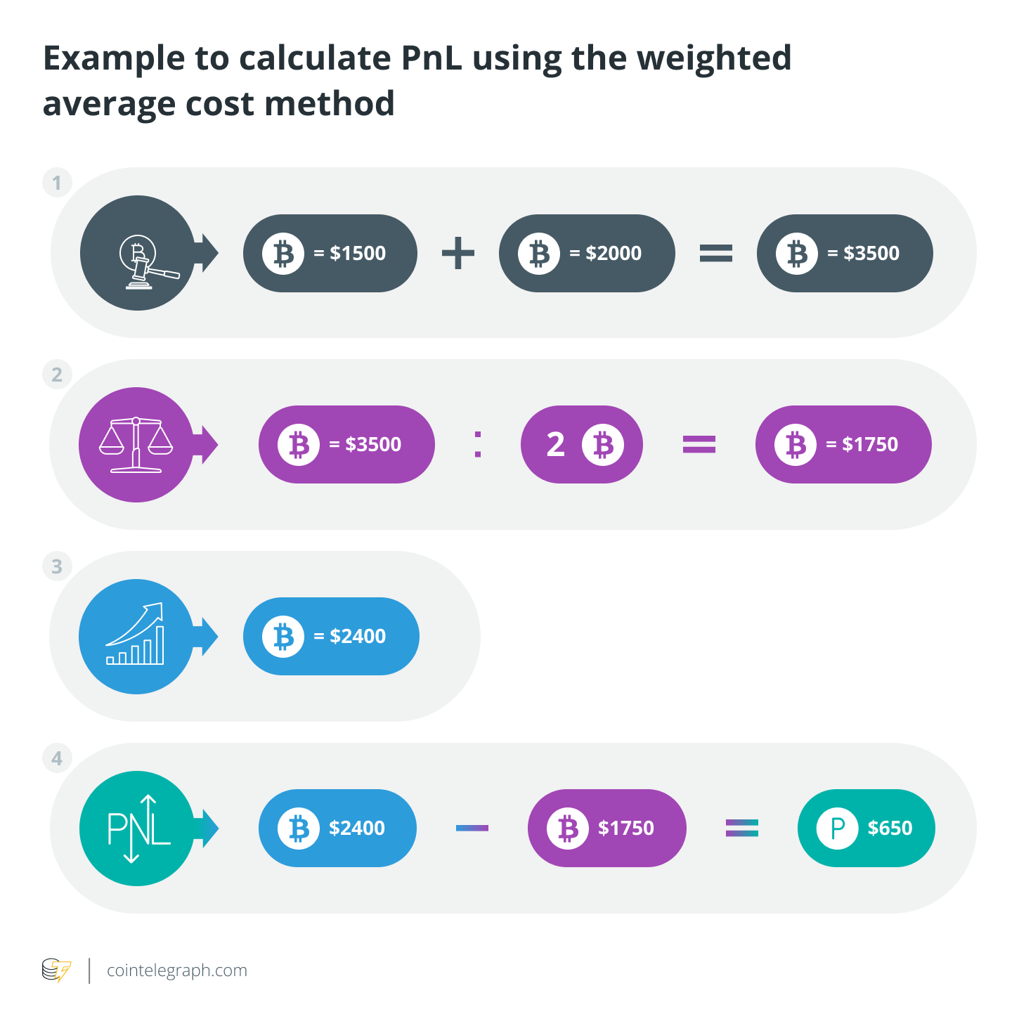 The weighted average cost method requires traders to determine the average cost of all units of a digital currency in their portfolio to arrive at the initial cost. Here are the steps to calculate PnL using this method: