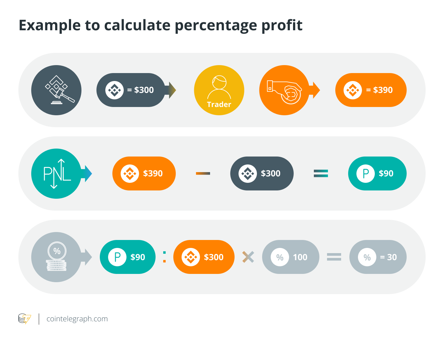 The percentage profit method reflects the PnL as a percentage of the initial cost. An example will help understand better. Suppose a trader buys 1 Binance Coin (BNB) for $300 and sells it for $390. In this case, the person’s PnL would be $90 profit ($390 - $300). To arrive at the percentage profit, the trader needs to divide the PnL by the purchase price and multiply the amount by 100 (($90 / $300) x 100). This amounts to 30%.