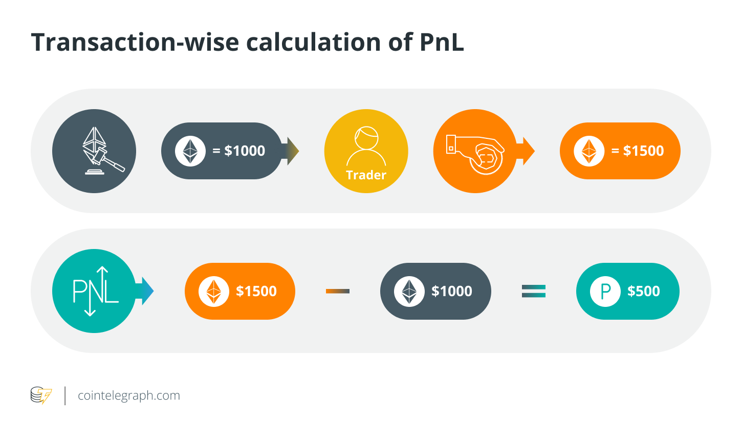 A transaction-based calculation requires a person to calculate the PnL for each specific transaction. For instance, if a person bought 1 $ETH for $1,000 and sold it for $1,500, the PnL for the transaction would be $500 profit ($1,500 - $1,000). If the number of transactions is small and a trader needs to calculate PnL for these transactions separately, a transaction-based calculation is an ideal method.