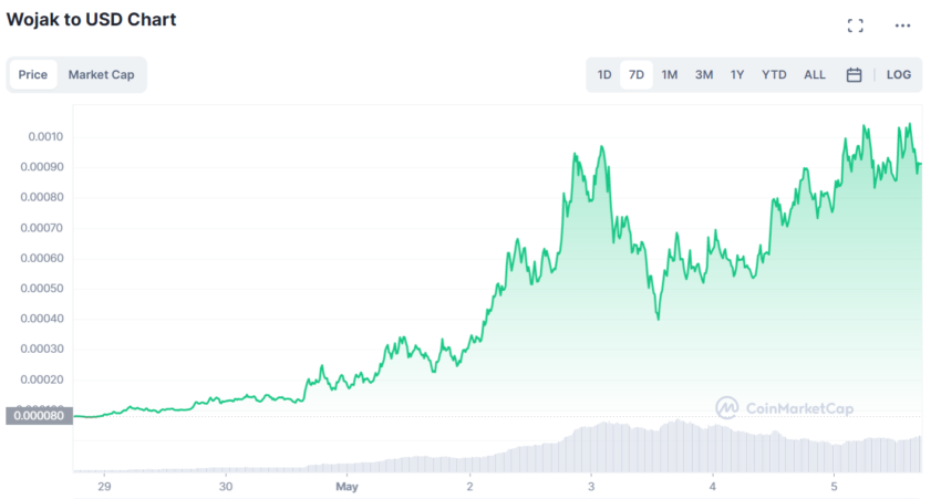 WOJAK, the Ethereum-based memecoin based on the drawing of a bald man with a variety of expressions, has had a great week on the markets. In the past seven days, the cryptoasset has jumped 1041%. Despite a tumultuous 24 hours, it remains up almost 6% at present.