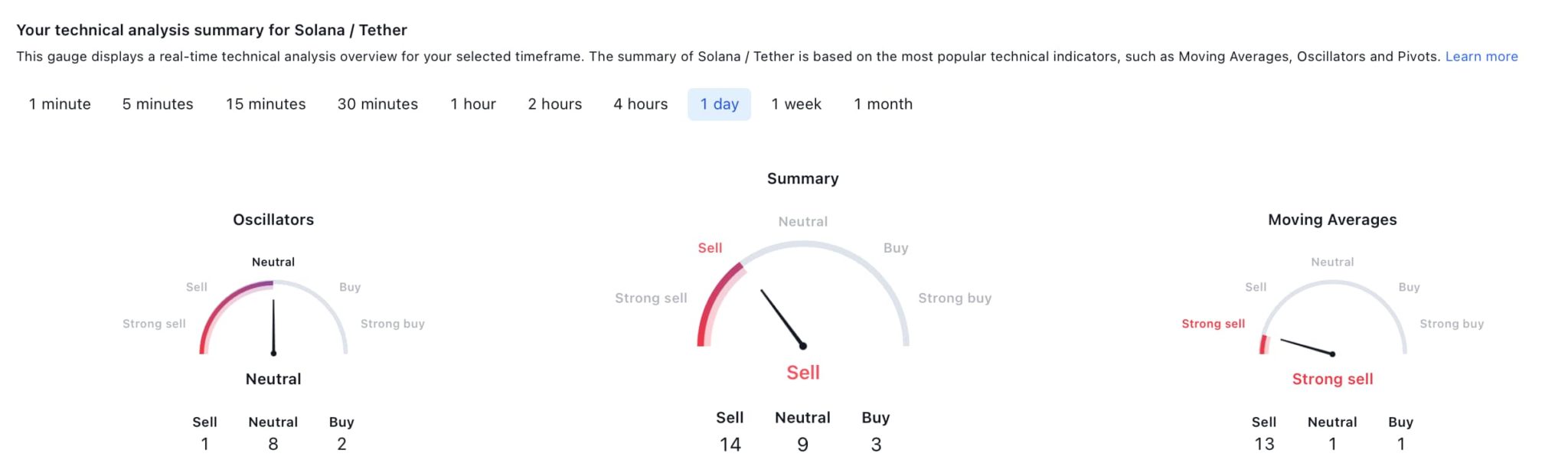 Meanwhile, the one-day gauges at the finance analytics platform TradingView indicate a bearish sentiment for Solana, considering that their summary is in the ‘sell’ area at 3 – the result of moving averages suggesting ‘strong sell’ at 13 and oscillators pointing to ‘neutral’ at 8.
