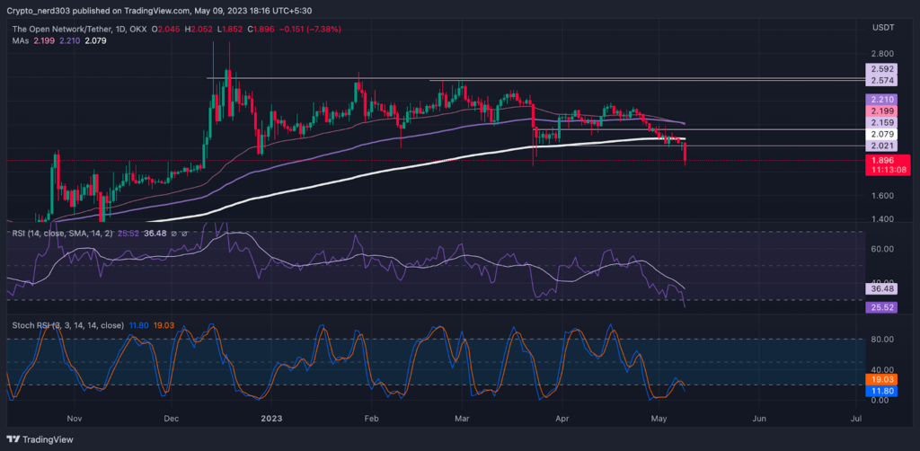 The TON price is currently observing strong selling pressure. The price is seeing a decline of more than 10% within the last 7 days. It recently made a breakdown through its major support level near the 200 EMA where it gave a first close below it within the last 7 months. This is a major indication of a change in trend. Investors may remain cautious regarding the current trend as the price may experience some volatility before the trend reversal.