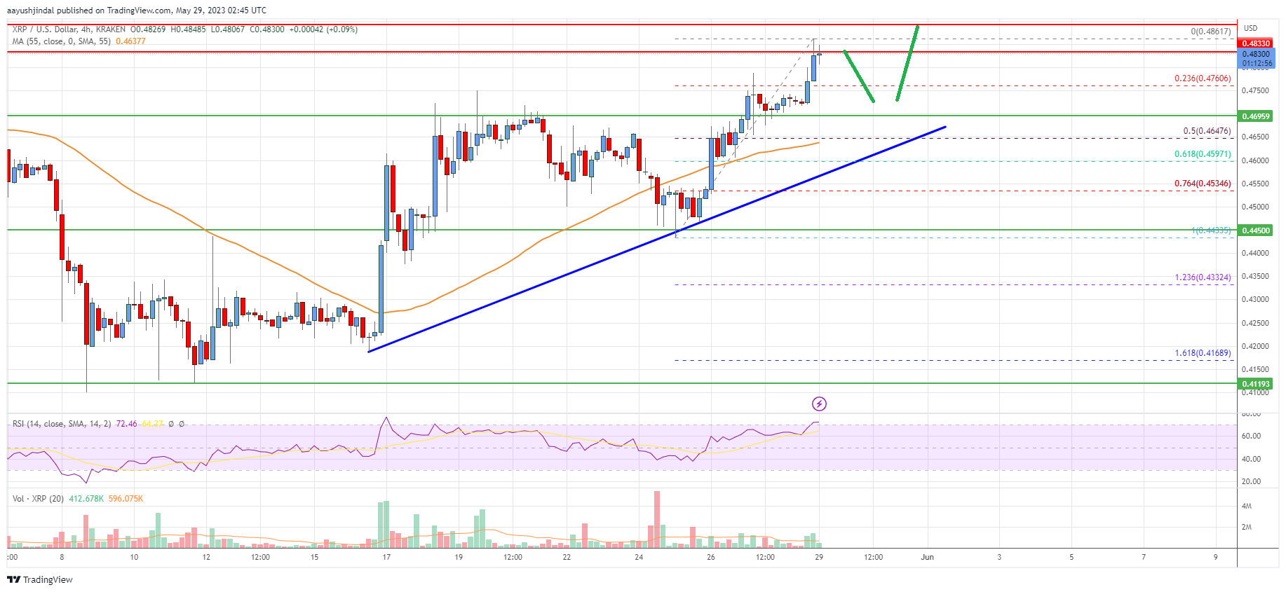 There was a clear move above the $0.450 resistance and the 55 simple moving average (4 hours). The bulls even pushed the price above the $0.470 resistance. A high is formed near $0.4861 and the price is now consolidating gains.