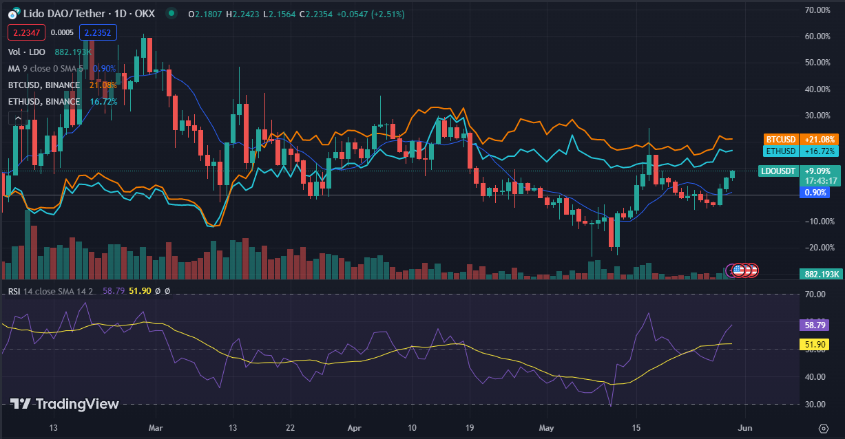Further, LDO is up 6% more than BTC and ETH. In addition, the total market cap of the crypto reached about $1.95 billion, which soared by around 6%. Moreover, Lido DAO growth significantly contributed to a 50% spike in the total trading volume, according to CMC data.
