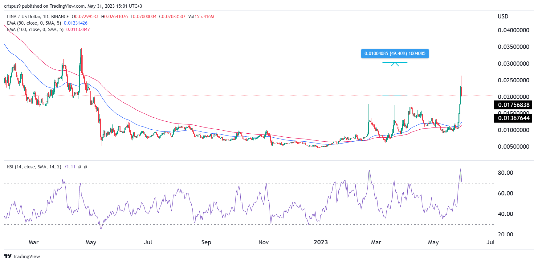 The daily chart shows that LINA crypto price has been in a strong bullish trend in the past few months. This week, the token managed to move above the important resistance point at $0.0194, the highest point on April 6.