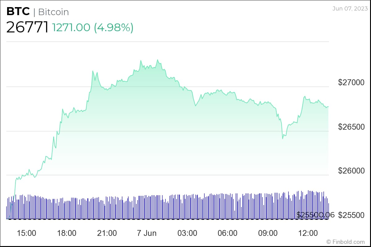 As expected, the resurgence in crypto prices was led by the leading cryptocurrency, Bitcoin (BTC), which soared nearly 5% in the past 24 hours. At press time, BTC was trading at $26,771.