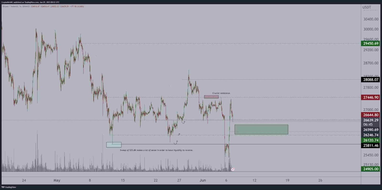 According to prominent crypto expert Michaël van de Poppe, Bitcoin must hold above the $26,100 mark “to avoid a cascade.” Otherwise, if it drops below that threshold, it would lead to a loss of the 200-weekly moving average (MA) on the global crypto market cap as well, he added.