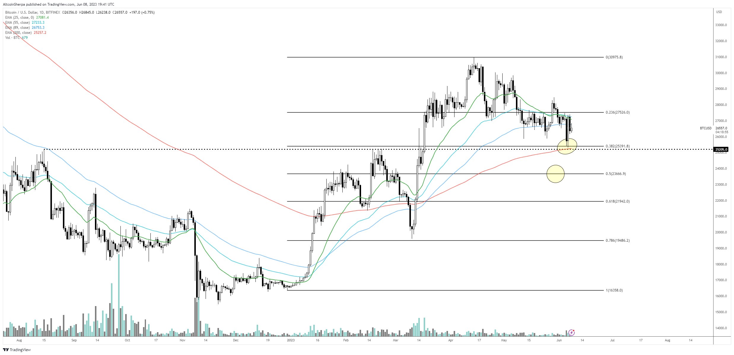 His chart shows the 200-day exponential moving average (EMA), an indicator used by traders to help determine the short-to-medium-term trend of an asset, rising toward the $25,391 price level, which is also the .382 Fibonacci level.