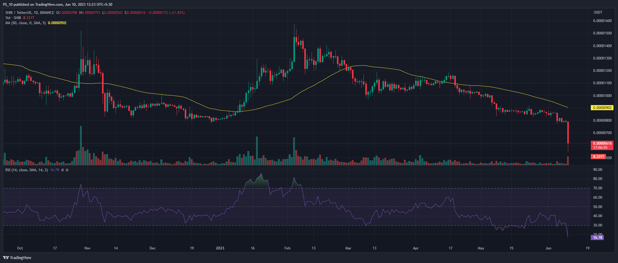 SHIB confirms its oversold state with its RSI of 16.78, as recorded during analysis. At press time, Shiba Inu traded at $0.000006204.