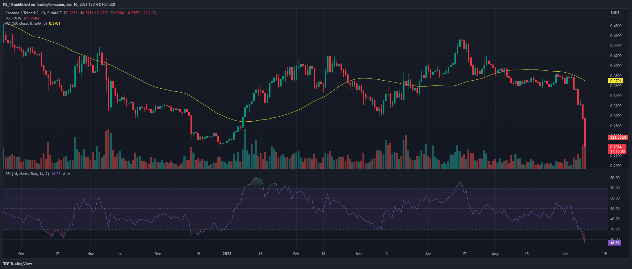 Cardano (ADA) displayed a fall of 24% over the past day. The crypto had marked its new 5-month-low at $0.22. ADA is currently in an extremely oversold state, as its relative strength index (RSI) was 16.55.