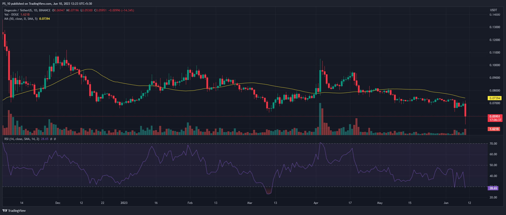 The dominant memecoin Dogecoin (DOGE) declined by 11.79% over the past 24 hours. DOGE recorded its 11-month-low at $0.053 during the Asian morning hours.