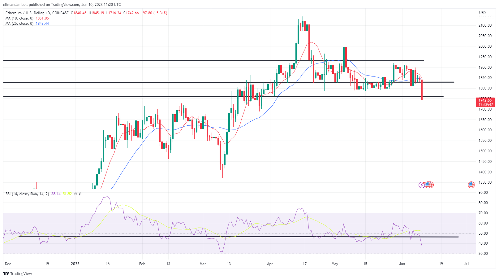 After climbing to a peak of $1,861.14 on Friday, ETH/USD slipped to a bottom of $1,721 earlier in today’s session.