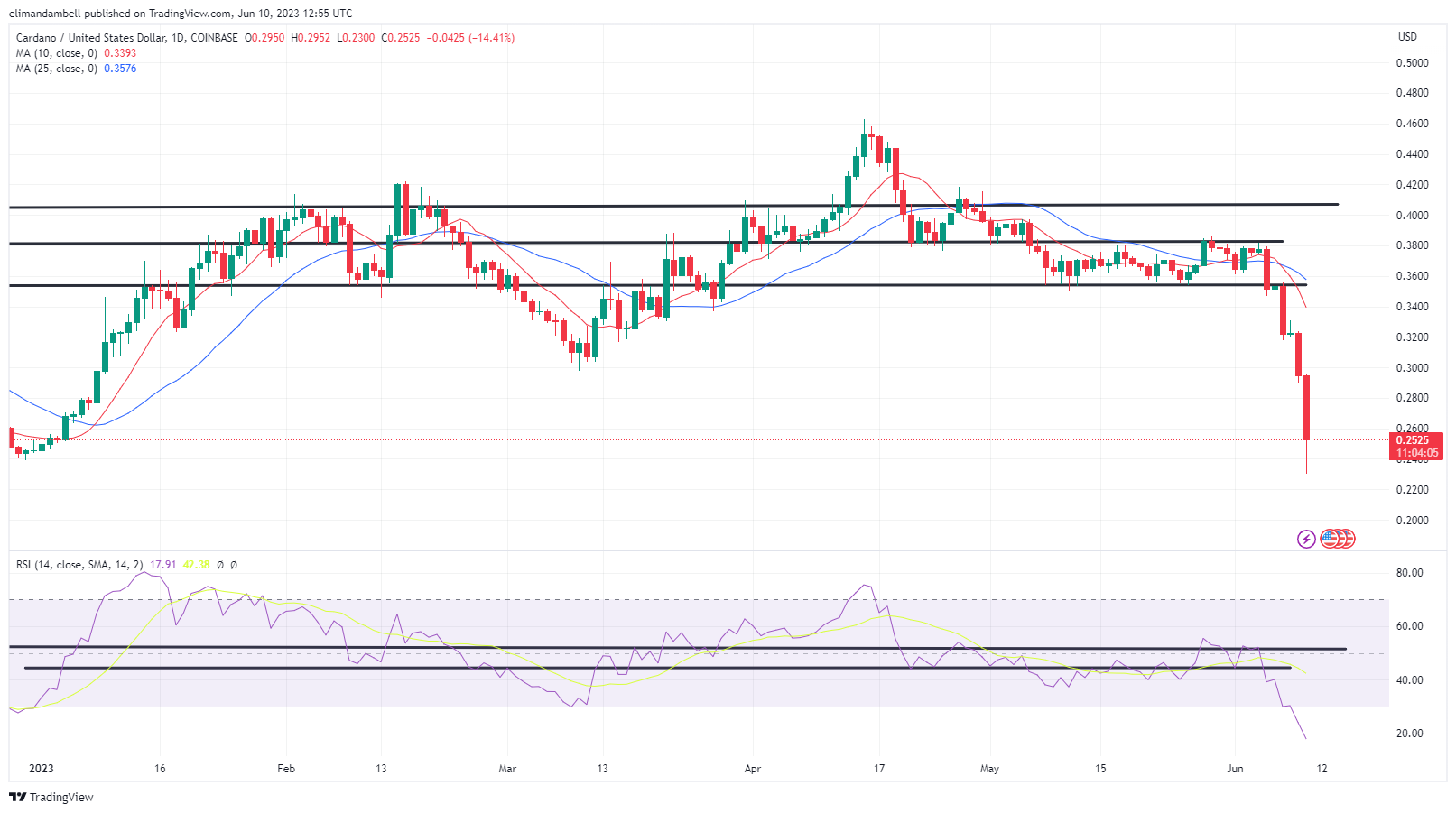 Cardano fell by over 25% on Saturday, as traders continued to react to the token being delisted from the Robinhood platform. The global cryptocurrency market cap is currently down by nearly 6%, following these developments. Polygon, which was also delisted, dropped to a one-year low to start the weekend.