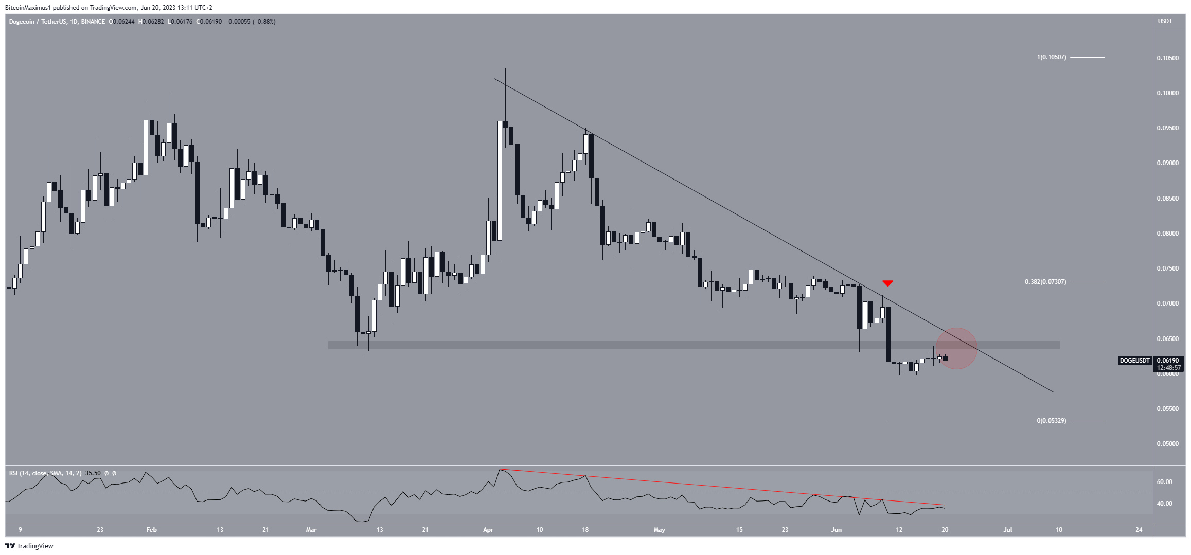 Alongside the descending resistance line, the RSI also follows a descending trendline (red line). So, the trend is considered bearish until the price breaks out. If another rejection occurs, the DOGE price could drop to $0.050.