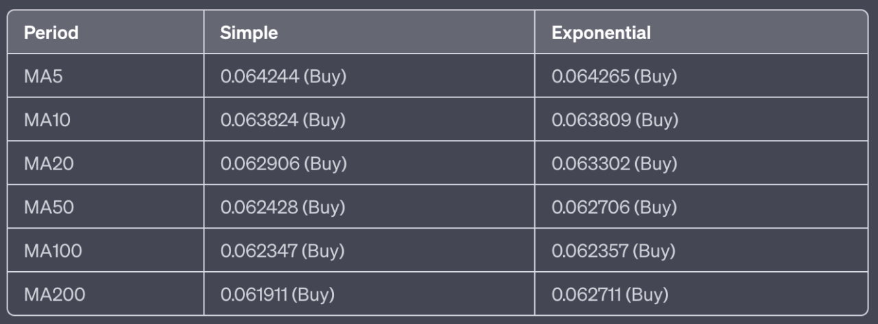 - MA100: The 100-day SMA is at 0.062347, which is below the current price. This is a buy signal, suggesting that the price is trending upward in the long term.